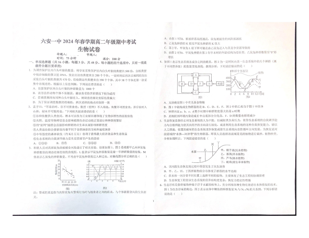 安徽省六安第一中学2023-2024学年高二下学期期中考试生物+答案