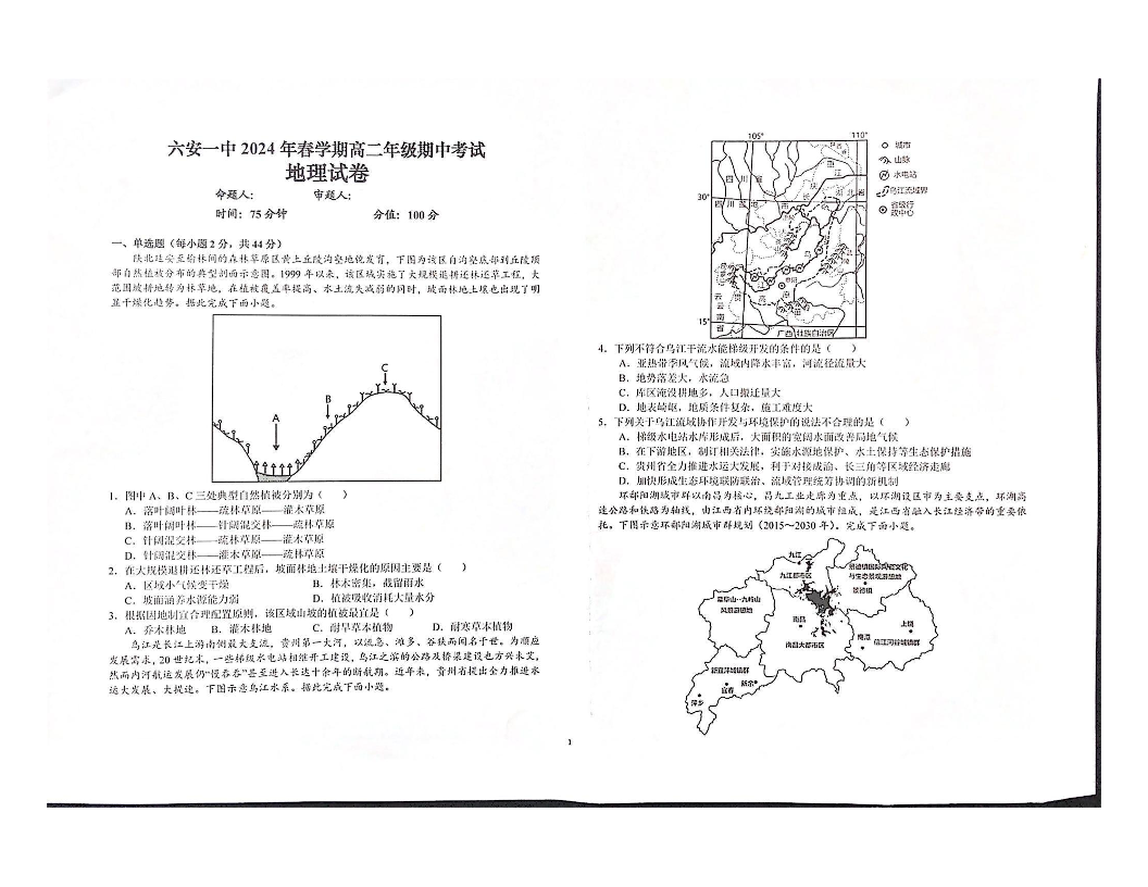 安徽省六安第一中学2023-2024学年高二下学期期中考试地理+答案