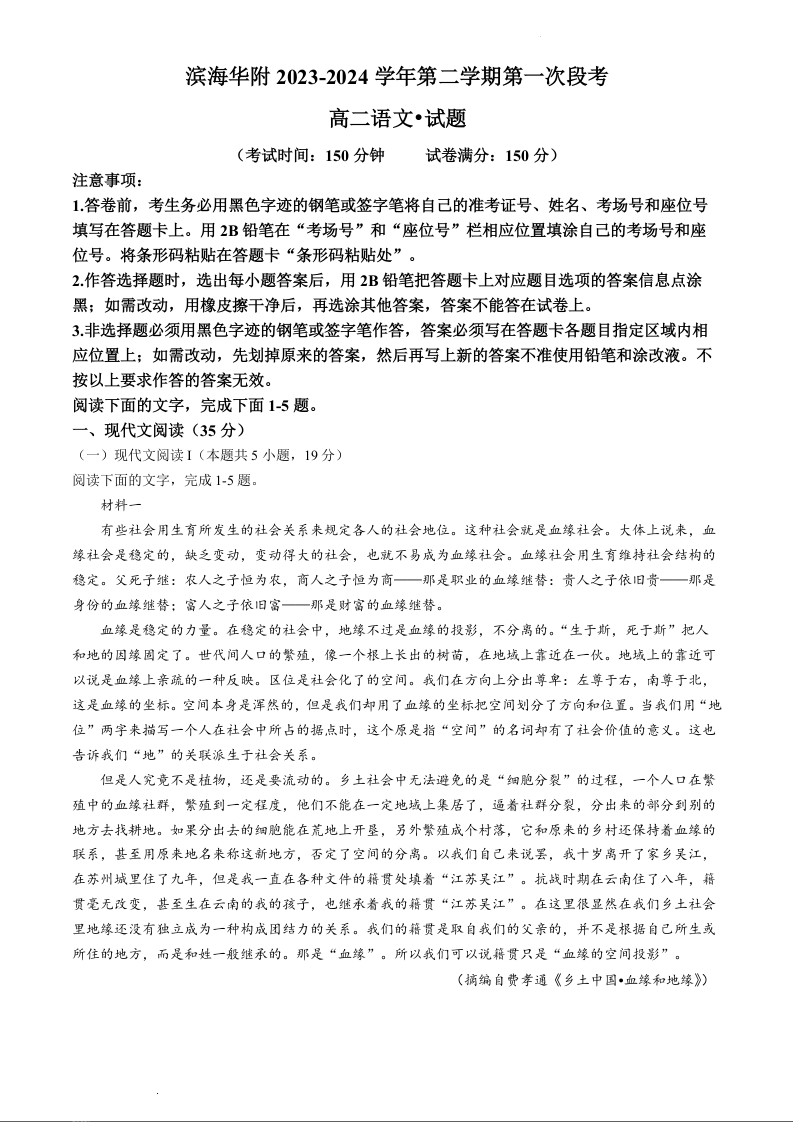 广东省华南师范大学附属茂名滨海学校2023-2024学年高二下学期4月期中考试语文+答案