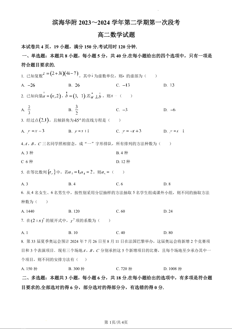 广东省华南师范大学附属茂名滨海学校2023-2024学年高二下学期4月期中考试数学(原卷版)