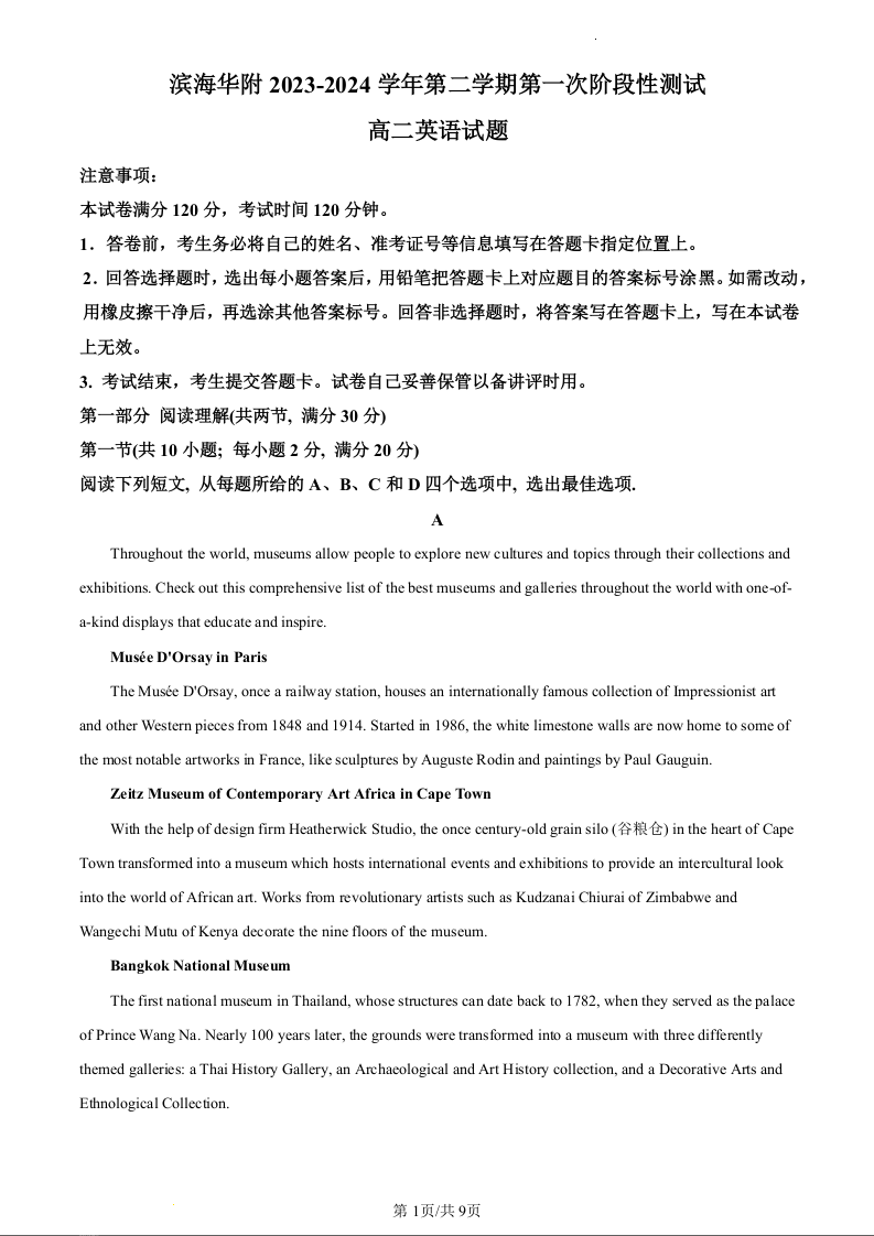 广东省华南师范大学附属茂名滨海学校2023-2024学年高二下学期4月期中考试英语(原卷版)