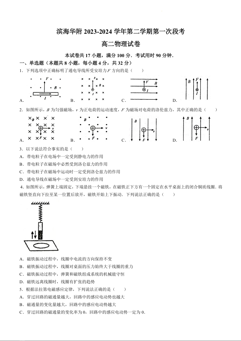 广东省华南师范大学附属茂名滨海学校2023-2024学年高二下学期4月期中考试物理