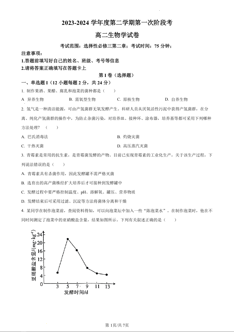 广东省华南师范大学附属茂名滨海学校2023-2024学年高二下学期4月期中考试生物(原卷版)