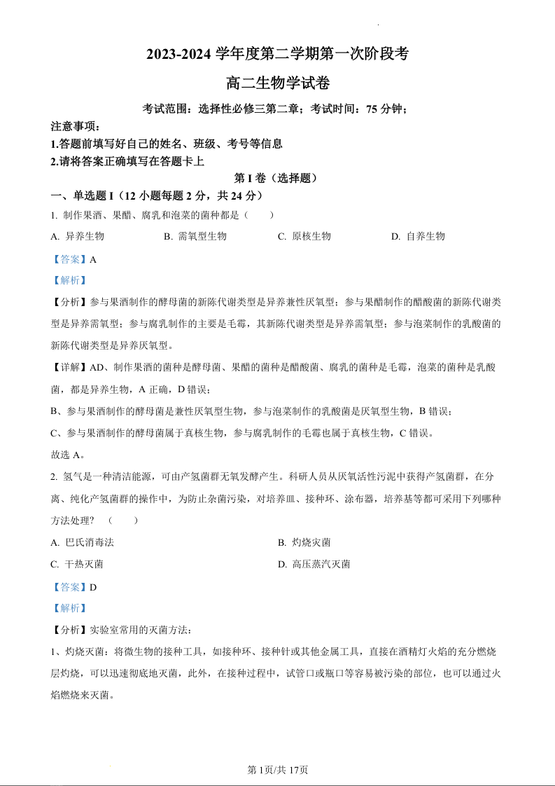广东省华南师范大学附属茂名滨海学校2023-2024学年高二下学期4月期中考试生物(精品解析版)