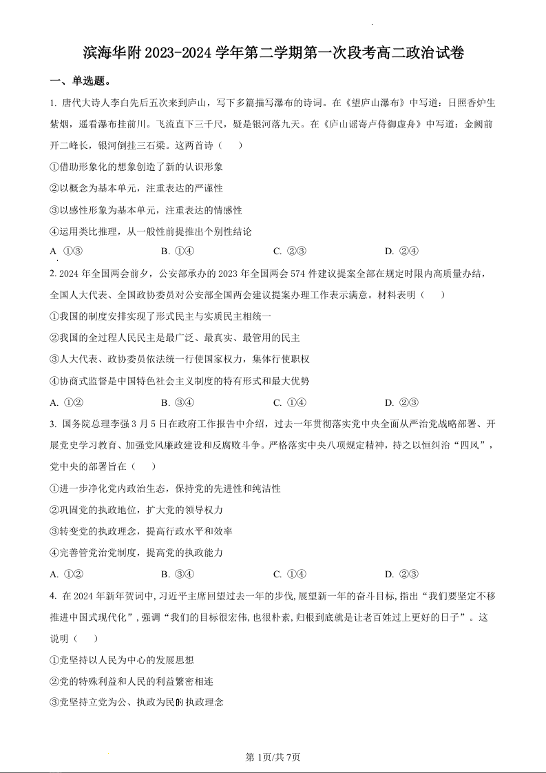 广东省华南师范大学附属茂名滨海学校2023-2024学年高二下学期4月期中考试政治(原卷版)