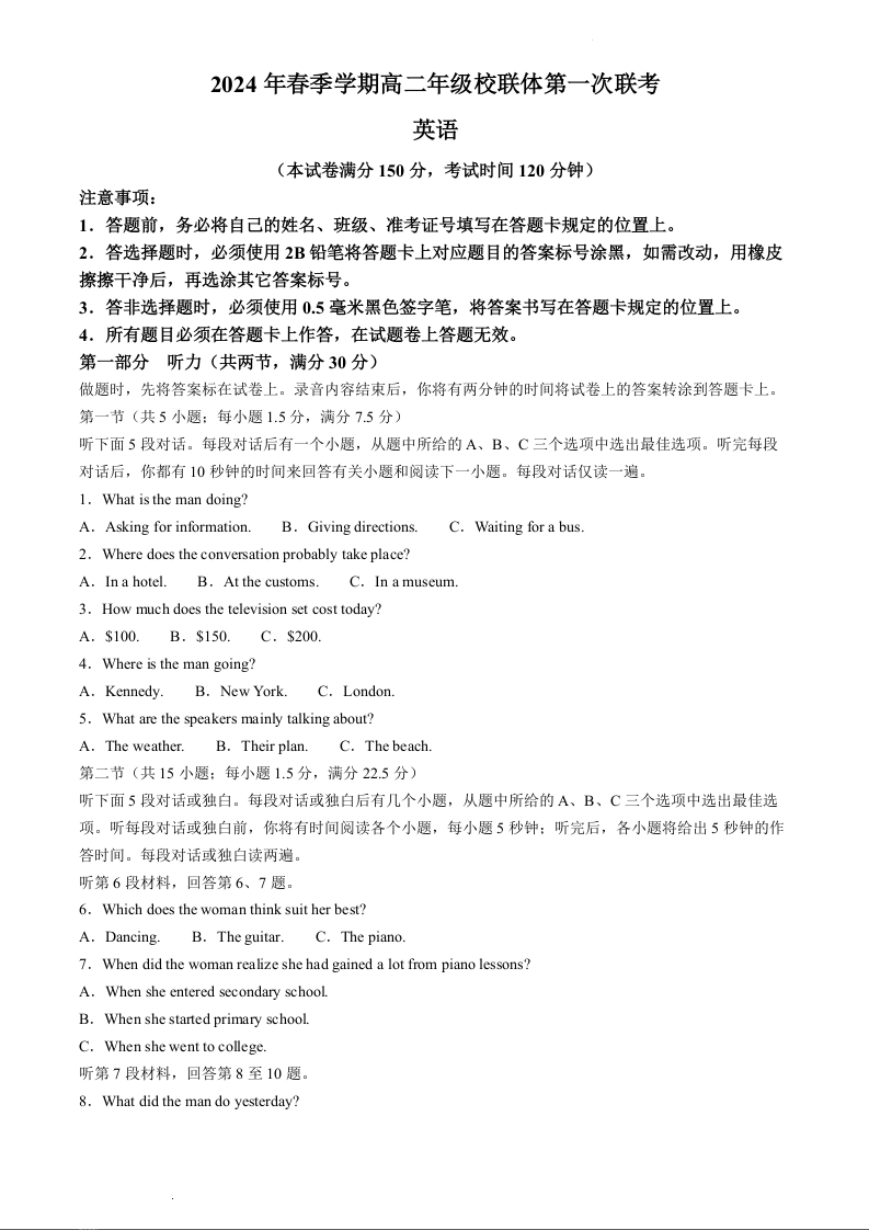 广西壮族自治区河池市十校2023-2024学年高二下学期4月联考英语+答案