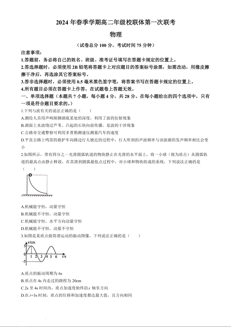 广西壮族自治区河池市十校2023-2024学年高二下学期4月联考物理+答案