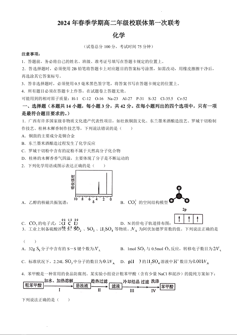 广西壮族自治区河池市十校2023-2024学年高二下学期4月联考化学+答案
