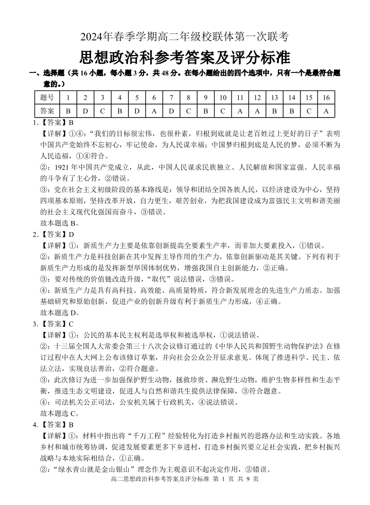广西壮族自治区河池市十校2023-2024学年高二下学期4月联考政治答案