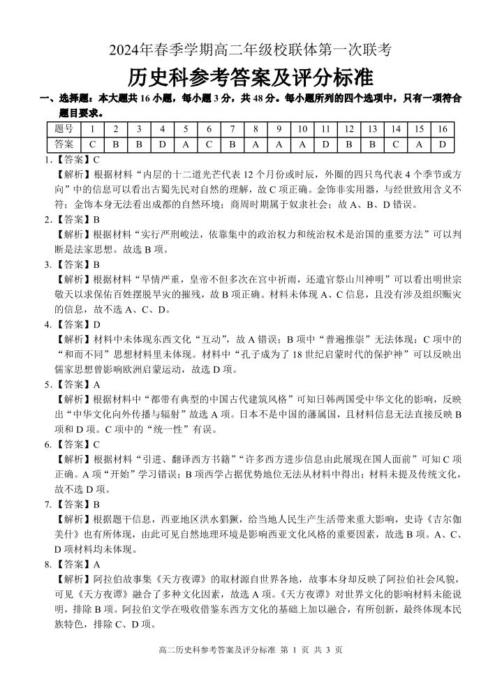 广西壮族自治区河池市十校2023-2024学年高二下学期4月联考历史答案