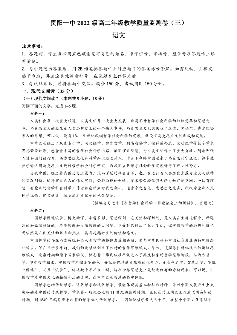 贵州省贵阳市第一中学2023-2024学年高二下学期期中考试语文+答案