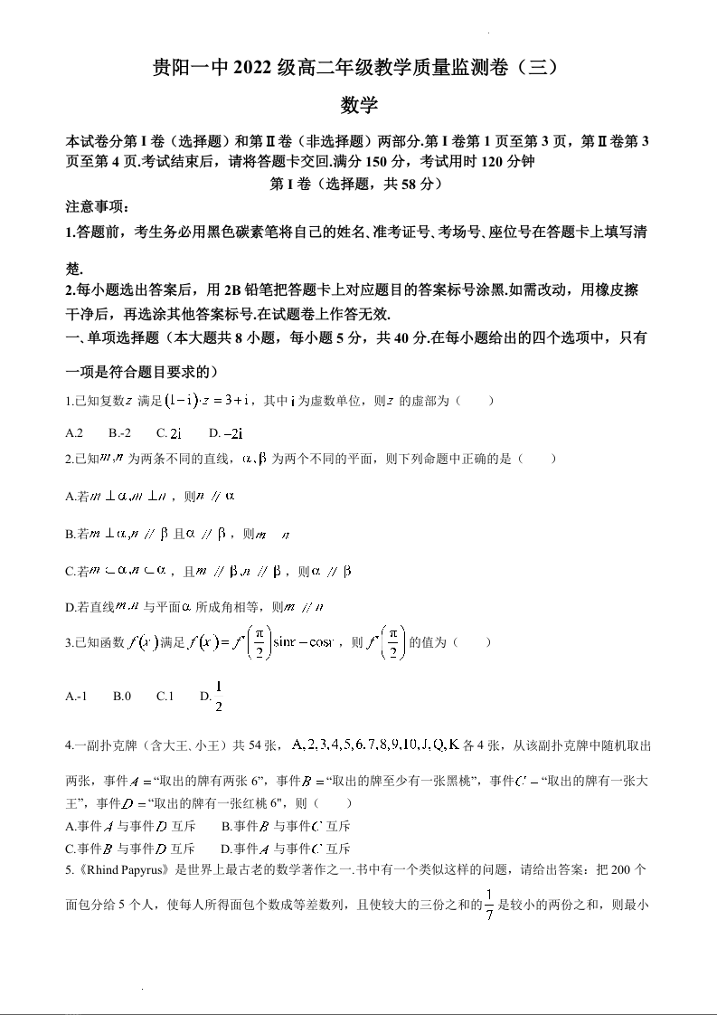 贵州省贵阳市第一中学2023-2024学年高二下学期期中考试数学+答案
