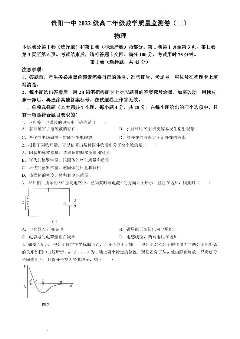 贵州省贵阳市第一中学2023-2024学年高二下学期期中考试物理+答案