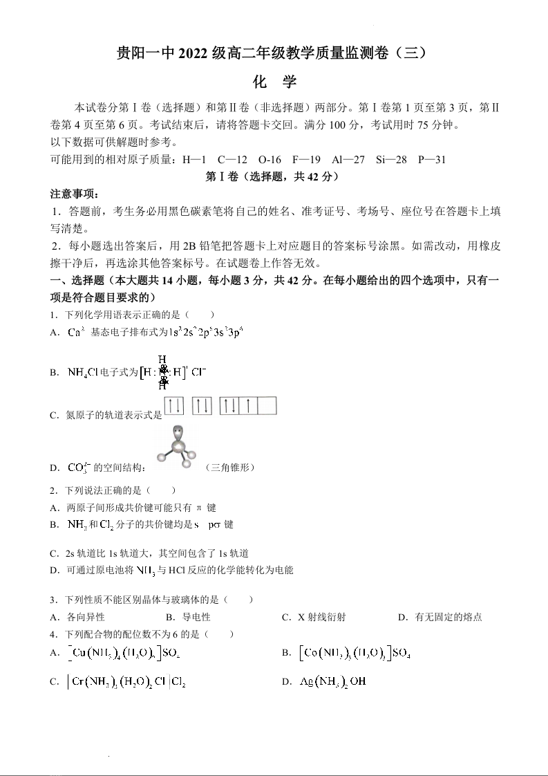 贵州省贵阳市第一中学2023-2024学年高二下学期期中考试化学+答案