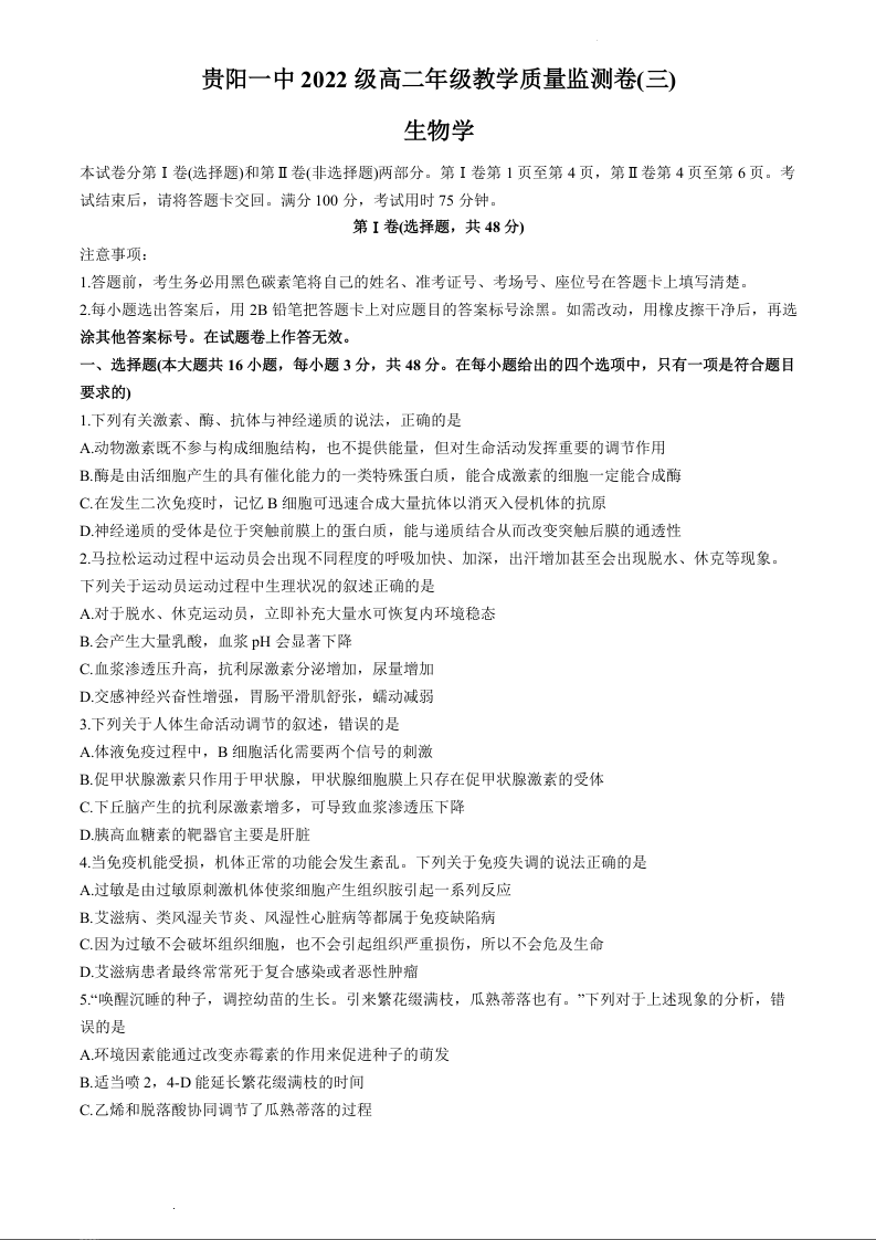 贵州省贵阳市第一中学2023-2024学年高二下学期期中考试生物+答案