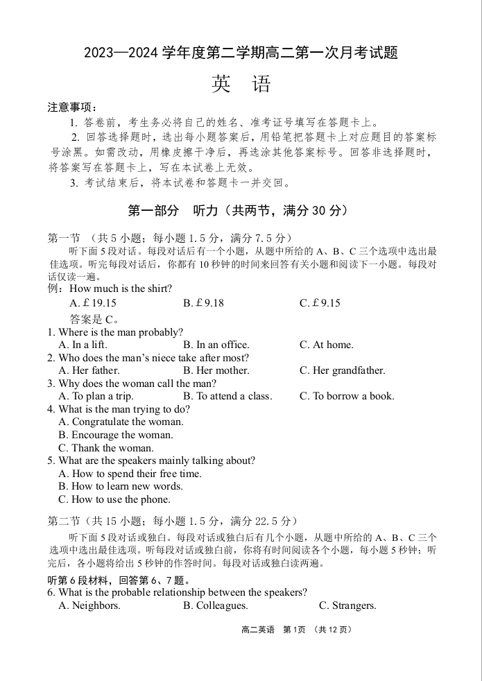 海南省文昌中学2023-2024学年高二下学期第一次月考英语