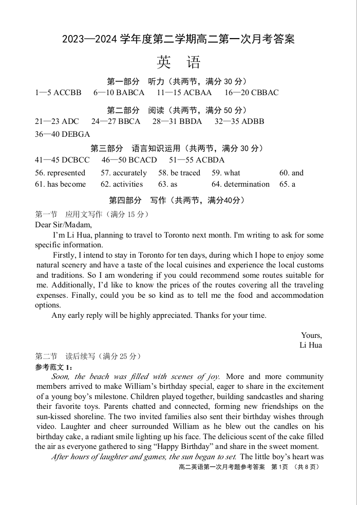 海南省文昌中学2023-2024学年高二下学期第一次月考英语答案