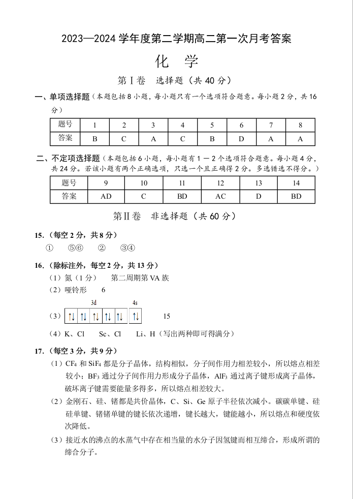 海南省文昌中学2023-2024学年高二下学期第一次月考化学答案