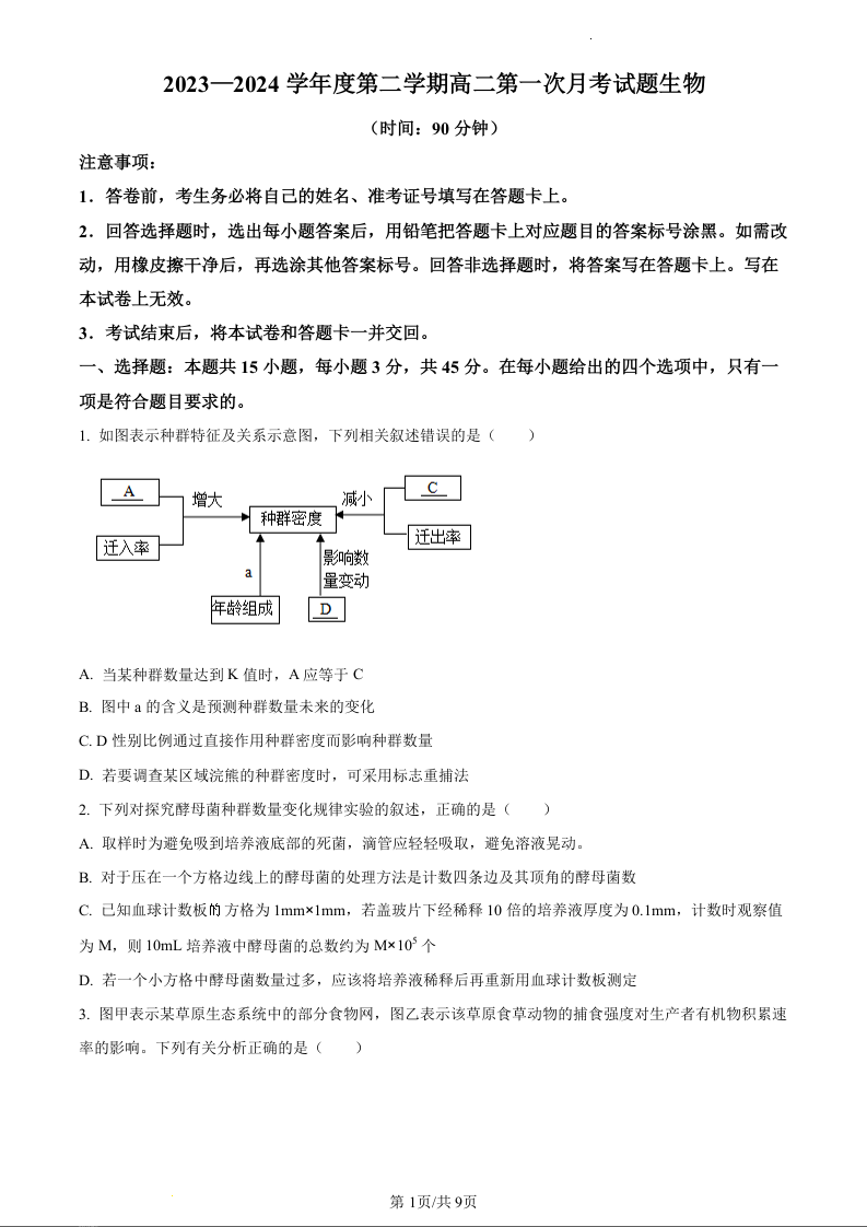 海南省文昌中学2023-2024学年高二下学期第一次月考生物(原卷版)