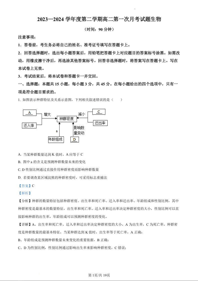 海南省文昌中学2023-2024学年高二下学期第一次月考生物(精品解析版)