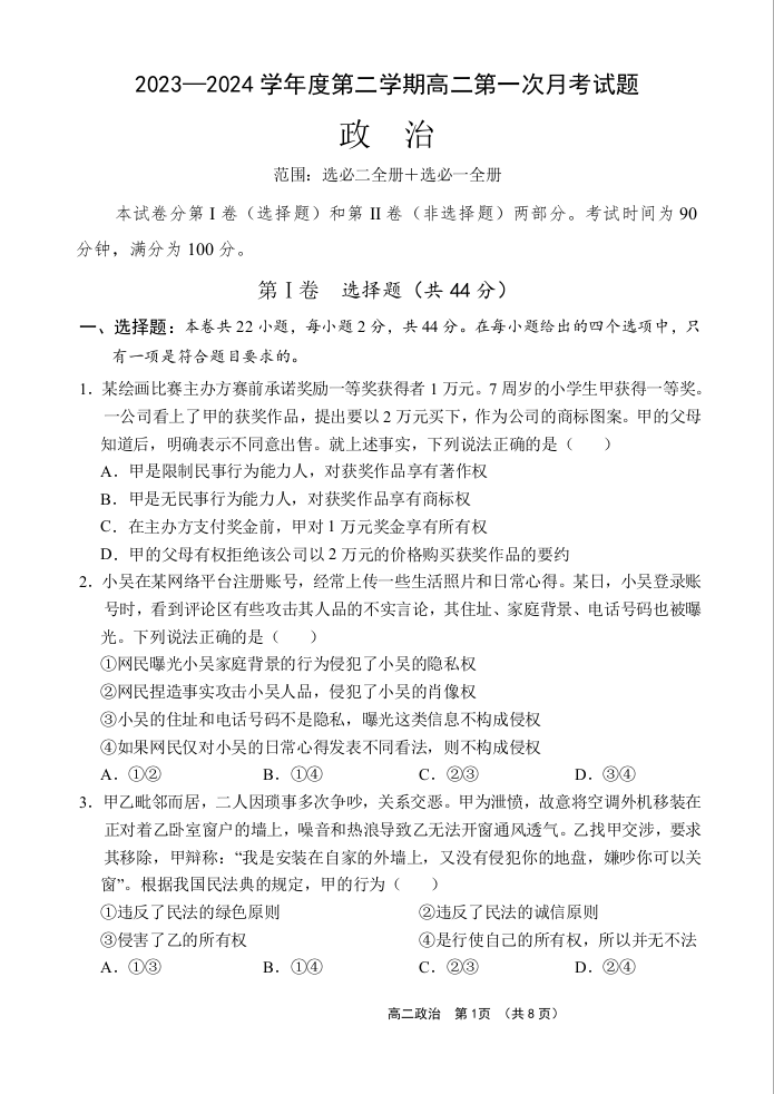 海南省文昌中学2023-2024学年高二下学期第一次月考政治