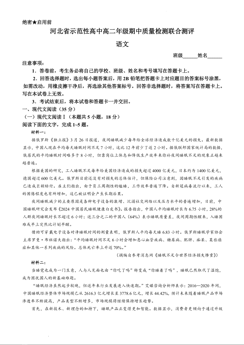 河北省示范性高中2023-2024学年高二下学期4月期中考试语文+答案