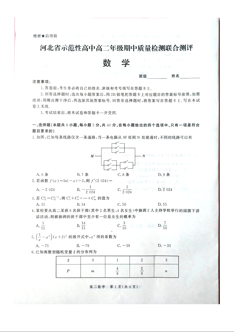 河北省示范性高中2023-2024学年高二下学期4月期中考试数学+答案