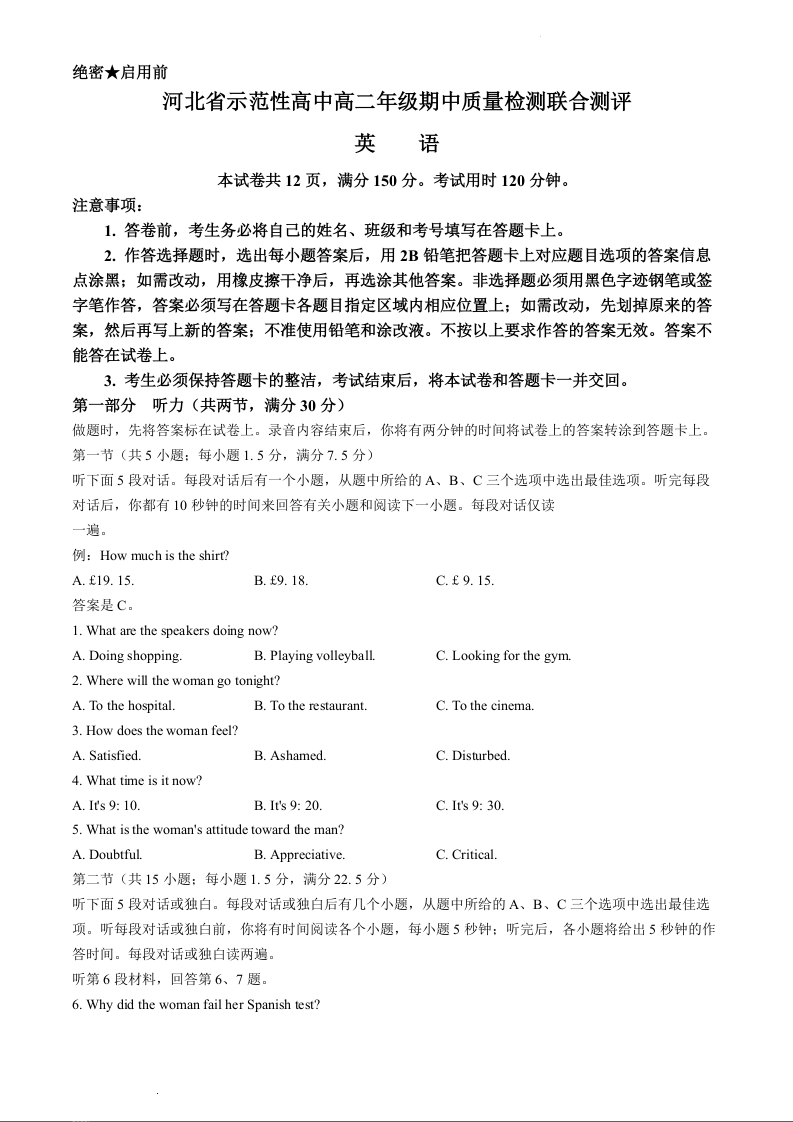 河北省示范性高中2023-2024学年高二下学期4月期中考试英语+答案