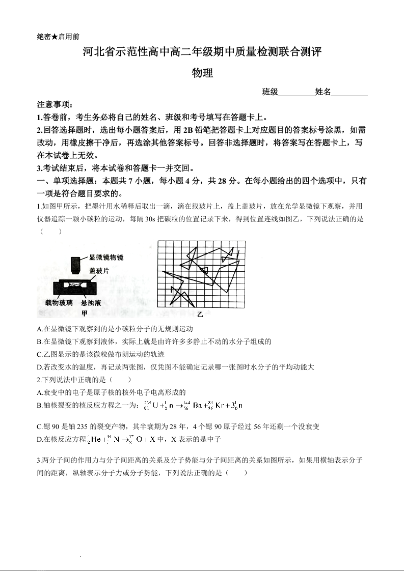 河北省示范性高中2023-2024学年高二下学期4月期中考试物理+答案