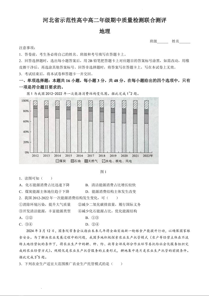 河北省示范性高中2023-2024学年高二下学期4月期中考试地理+答案