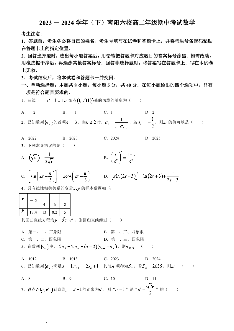 河南省南阳市六校联考2023-2024学年高二下学期4月期中考试数学+答案