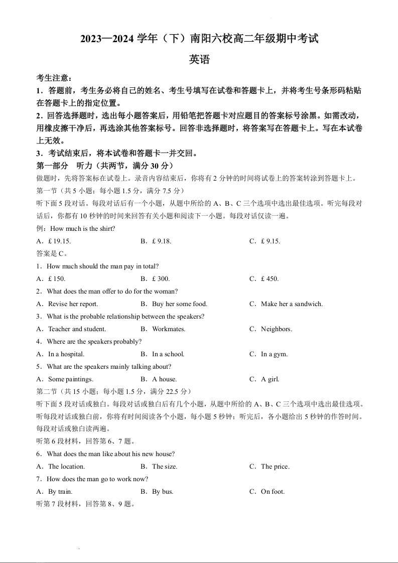 河南省南阳市六校联考2023-2024学年高二下学期4月期中考试英语+答案