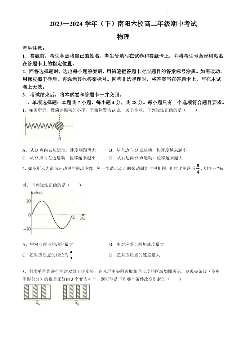 河南省南阳市六校联考2023-2024学年高二下学期4月期中考试物理+答案