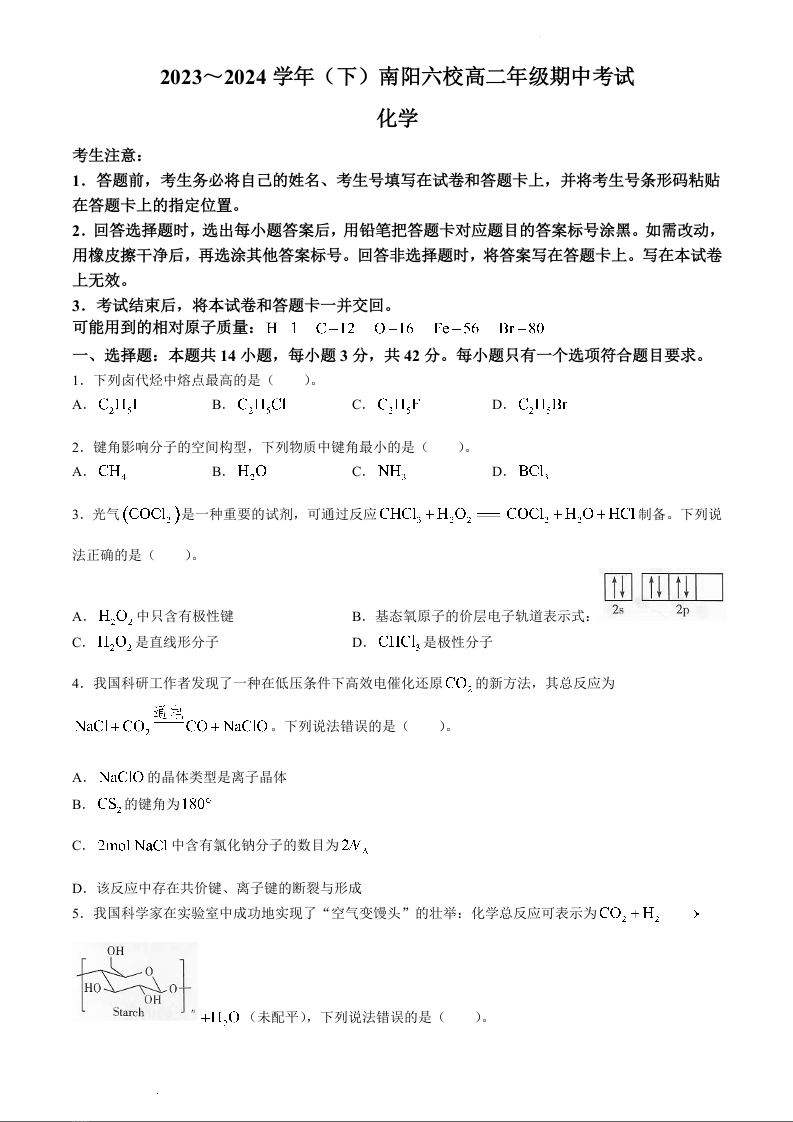 河南省南阳市六校联考2023-2024学年高二下学期4月期中考试化学+答案