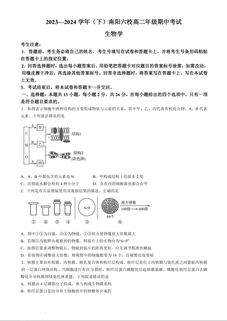 河南省南阳市六校联考2023-2024学年高二下学期4月期中考试生物+答案