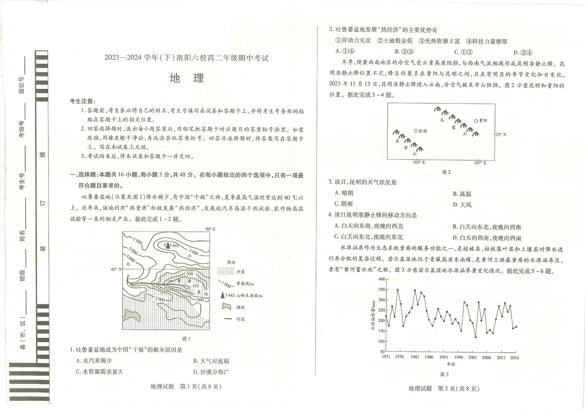 河南省南阳市六校联考2023-2024学年高二下学期4月期中考试地理+答案