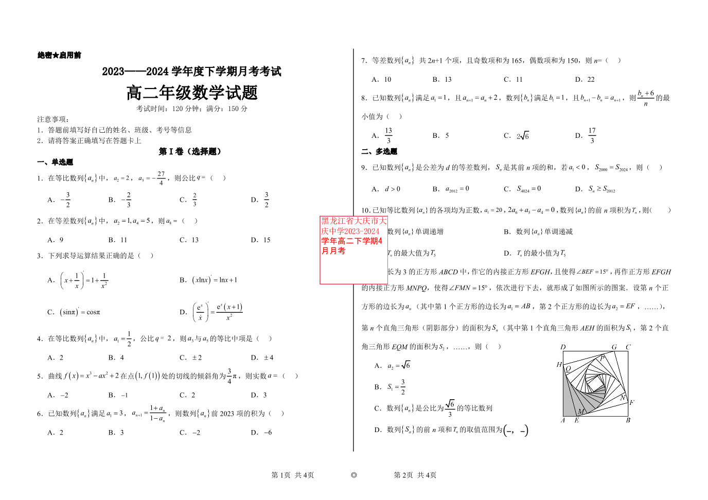 黑龙江省大庆市大庆中学2023-2024学年高二下学期4月月考数学