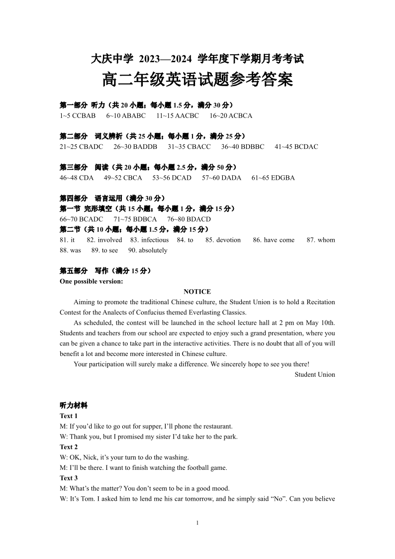黑龙江省大庆市大庆中学2023-2024学年高二下学期4月月考英语答案