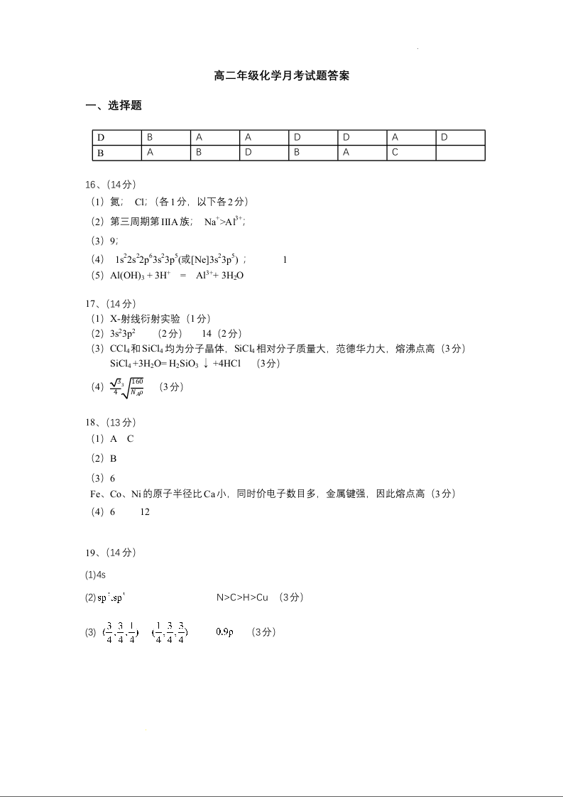 黑龙江省大庆市大庆中学2023-2024学年高二下学期4月月考化学答案