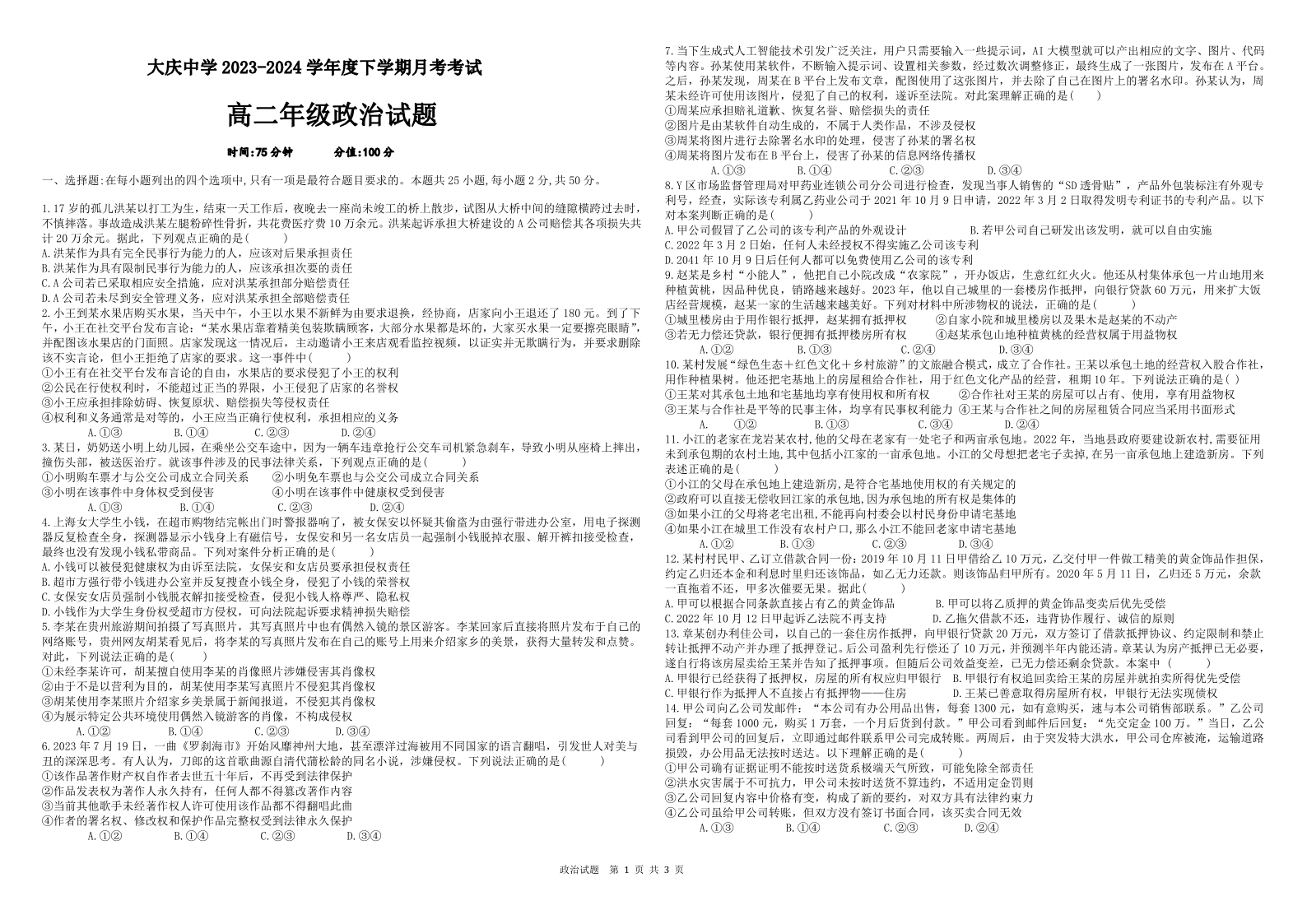 黑龙江省大庆市大庆中学2023-2024学年高二下学期4月月考政治