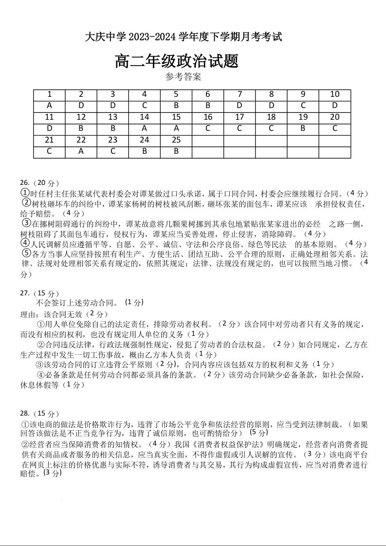 黑龙江省大庆市大庆中学2023-2024学年高二下学期4月月考政治答案
