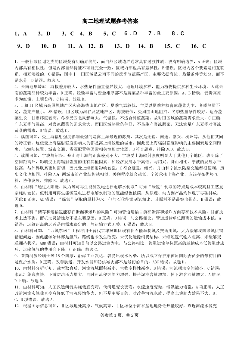 黑龙江省大庆市大庆中学2023-2024学年高二下学期4月月考地理答案