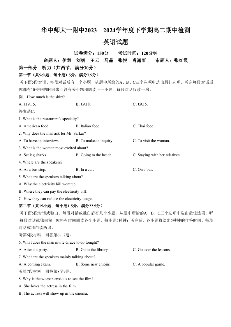 湖北省武汉市华中师范大学第一附属中学2023-2024学年高二下学期期中考试英语