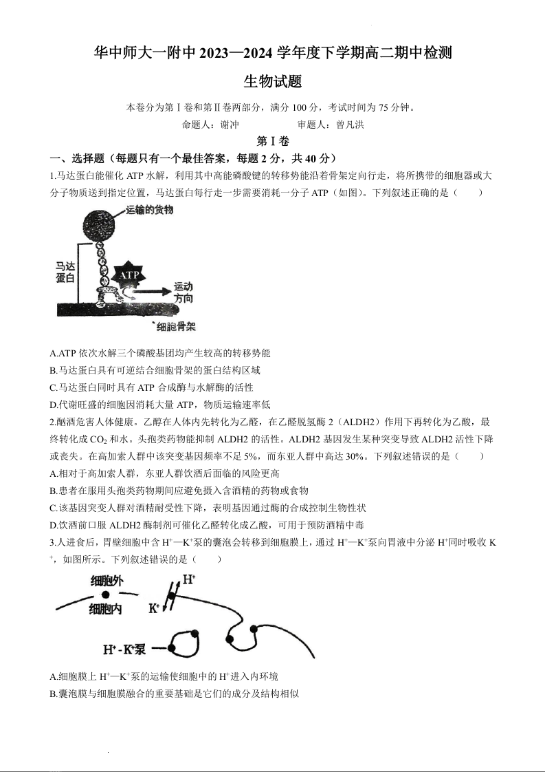 湖北省武汉市华中师范大学第一附属中学2023-2024学年高二下学期期中考试生物