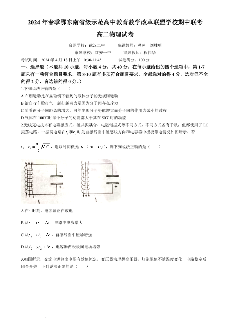 湖北省鄂东南省级示范高中教育教学改革联盟学校2023-2024学年高二下学期期中联考物理