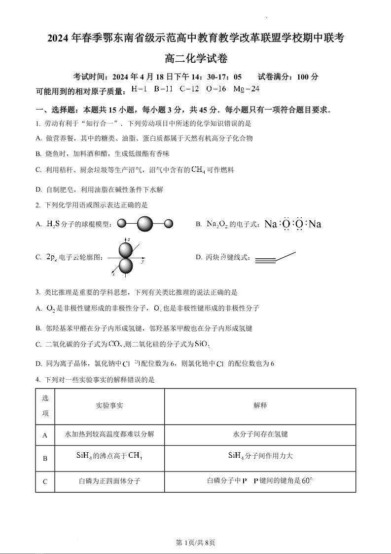 湖北省鄂东南省级示范高中教育教学改革联盟学校2023-2024学年高二下学期期中联考化学(原卷版)