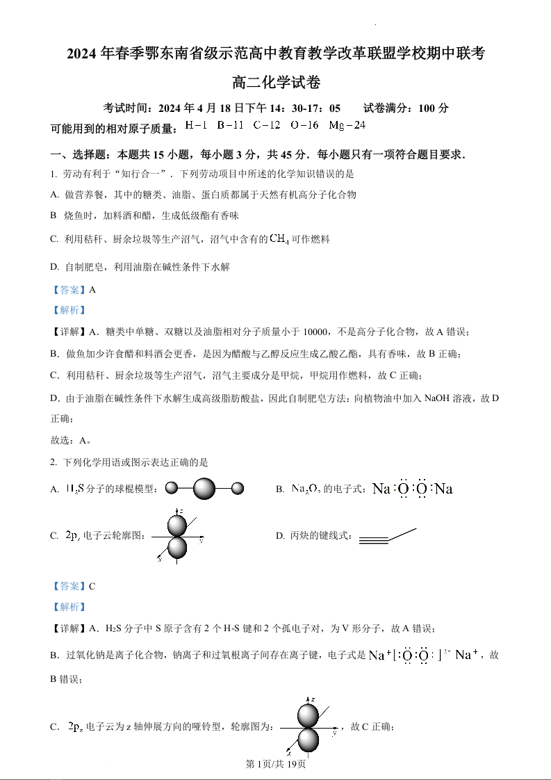 湖北省鄂东南省级示范高中教育教学改革联盟学校2023-2024学年高二下学期期中联考化学(精品解析版)