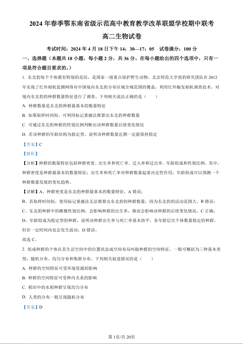 湖北省鄂东南省级示范高中教育教学改革联盟学校2023-2024学年高二下学期期中联考生物(精品解析版)
