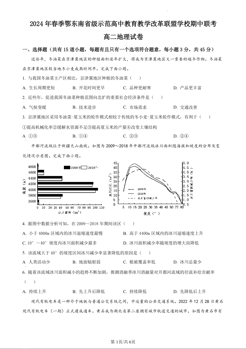 湖北省鄂东南省级示范高中教育教学改革联盟学校2023-2024学年高二下学期期中联考地理(原卷版)