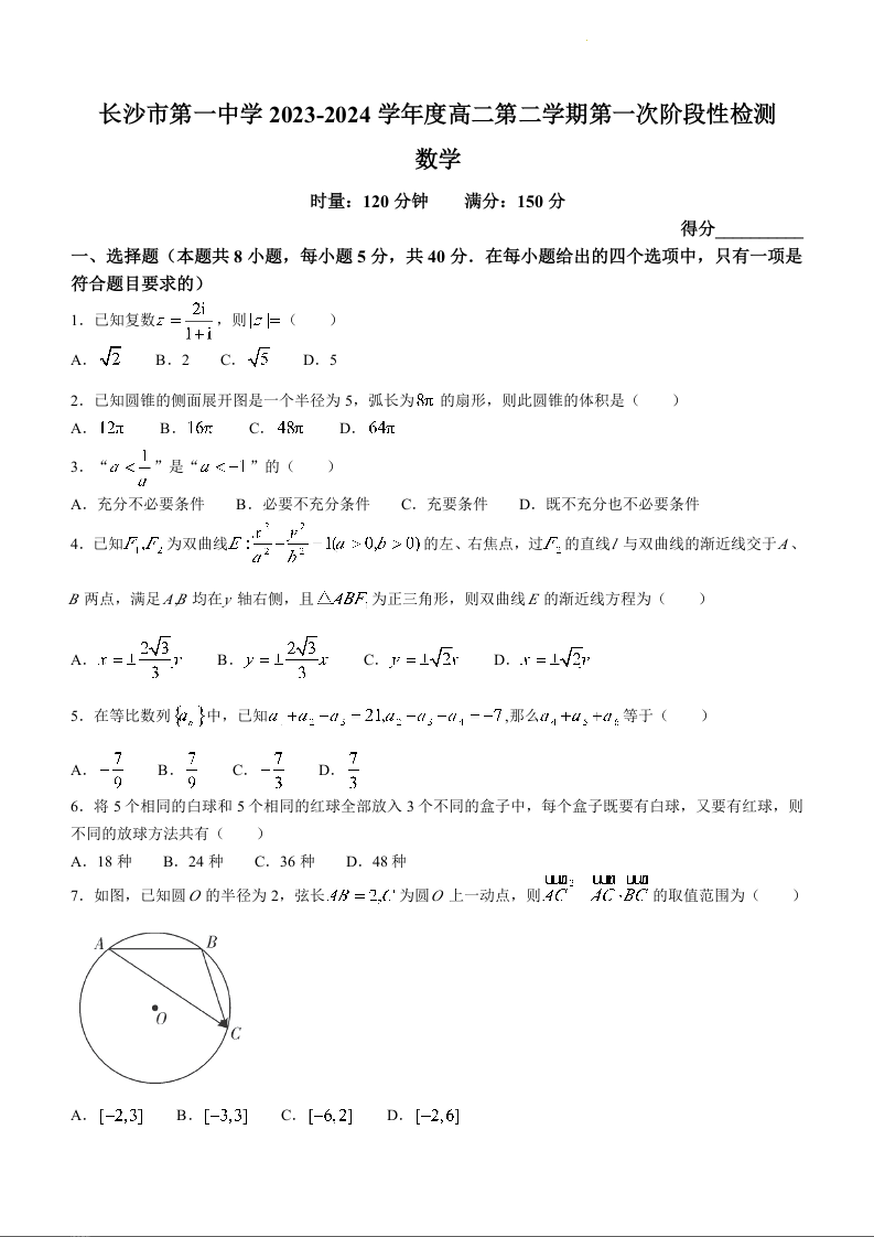 湖南省长沙市第一中学2023-2024学年高二下学期第一次月考数学+答案